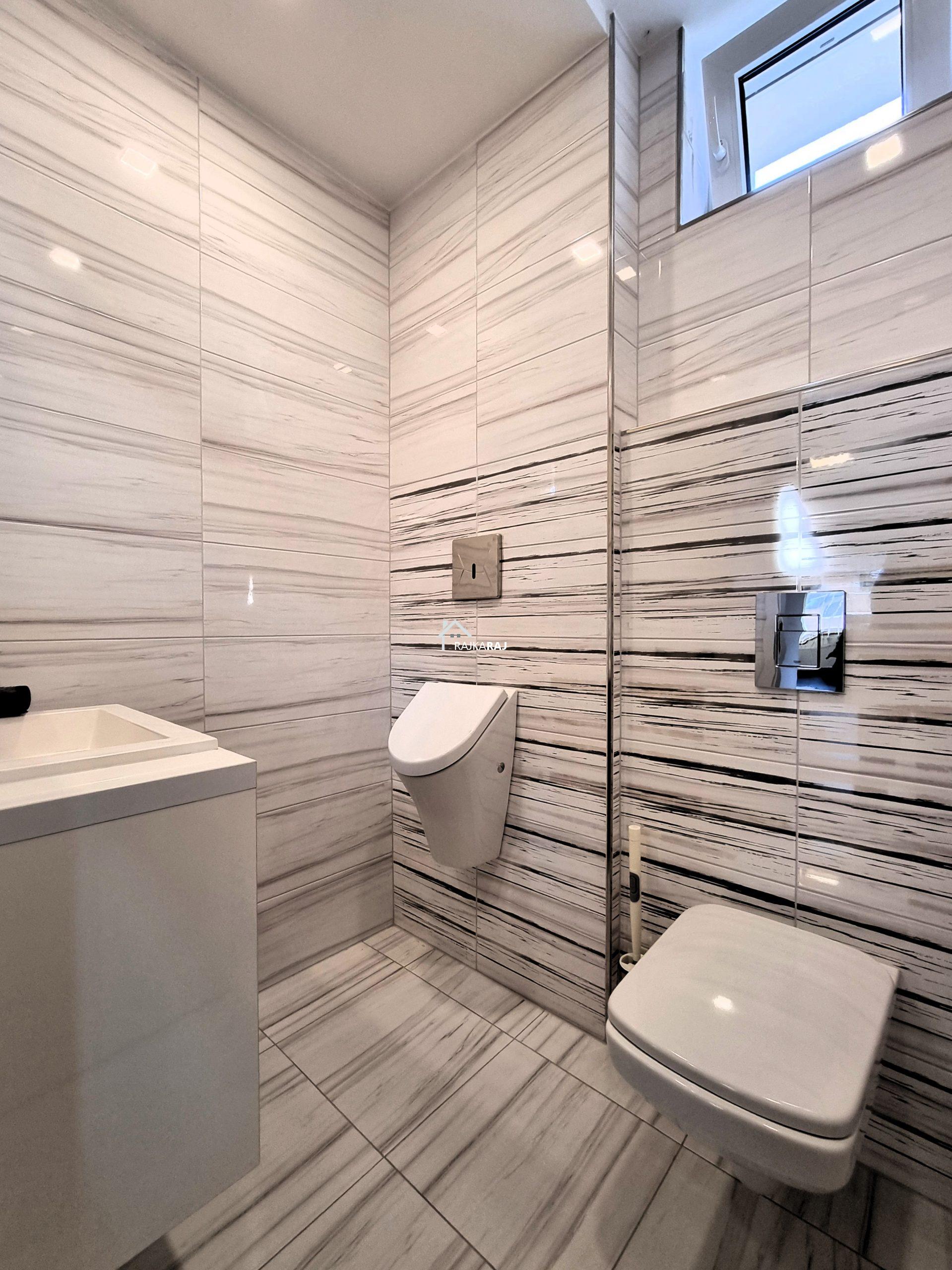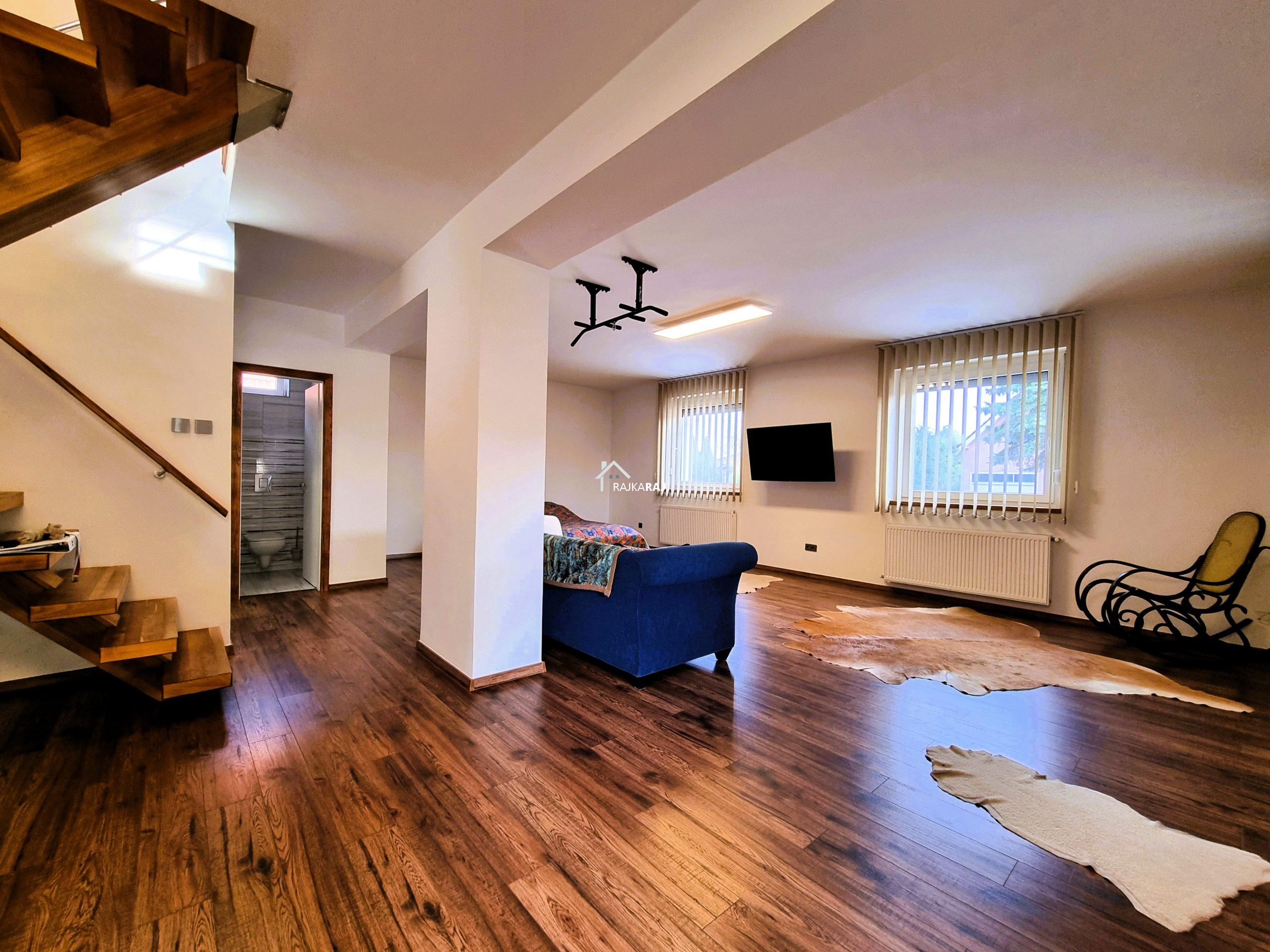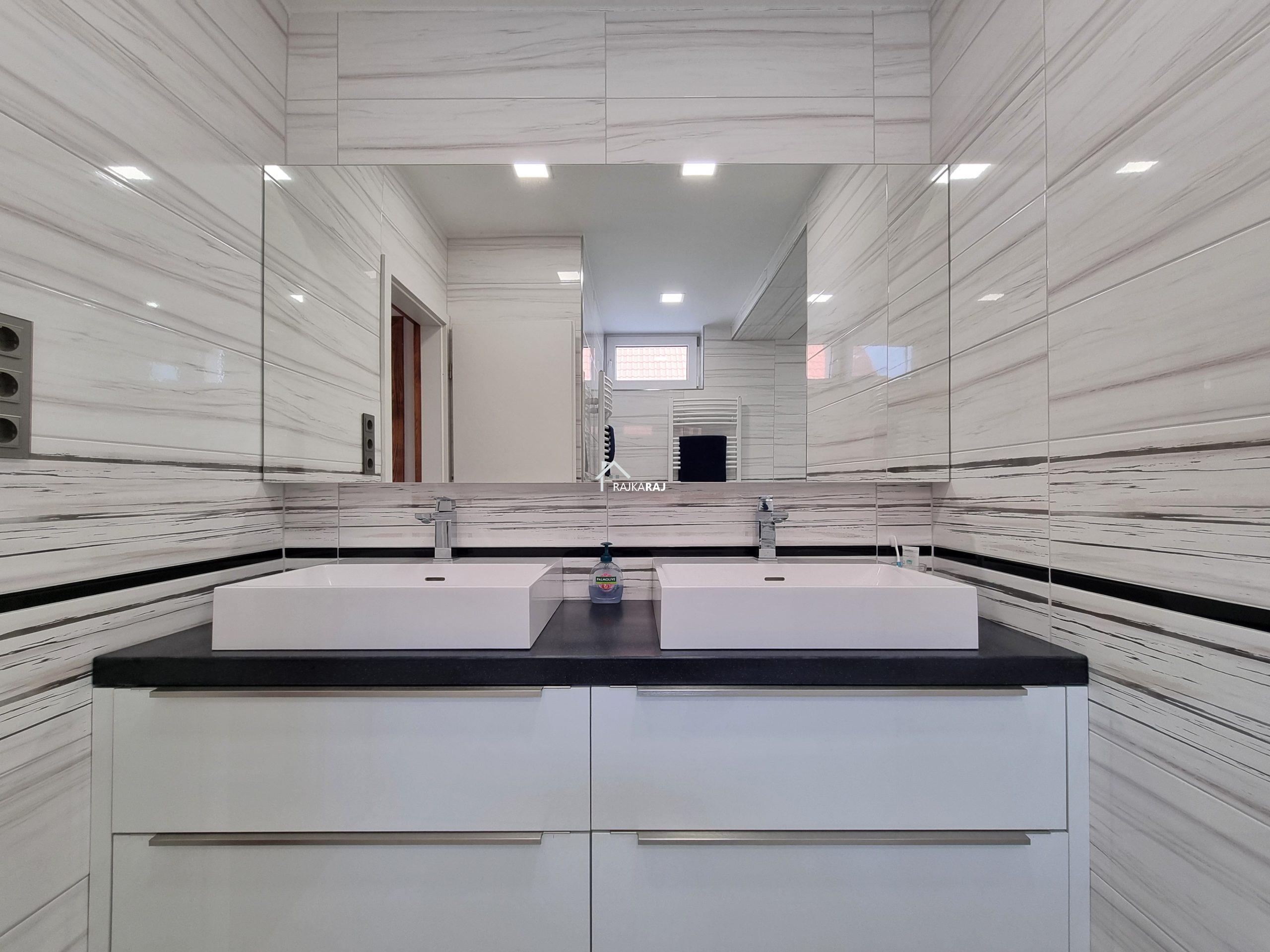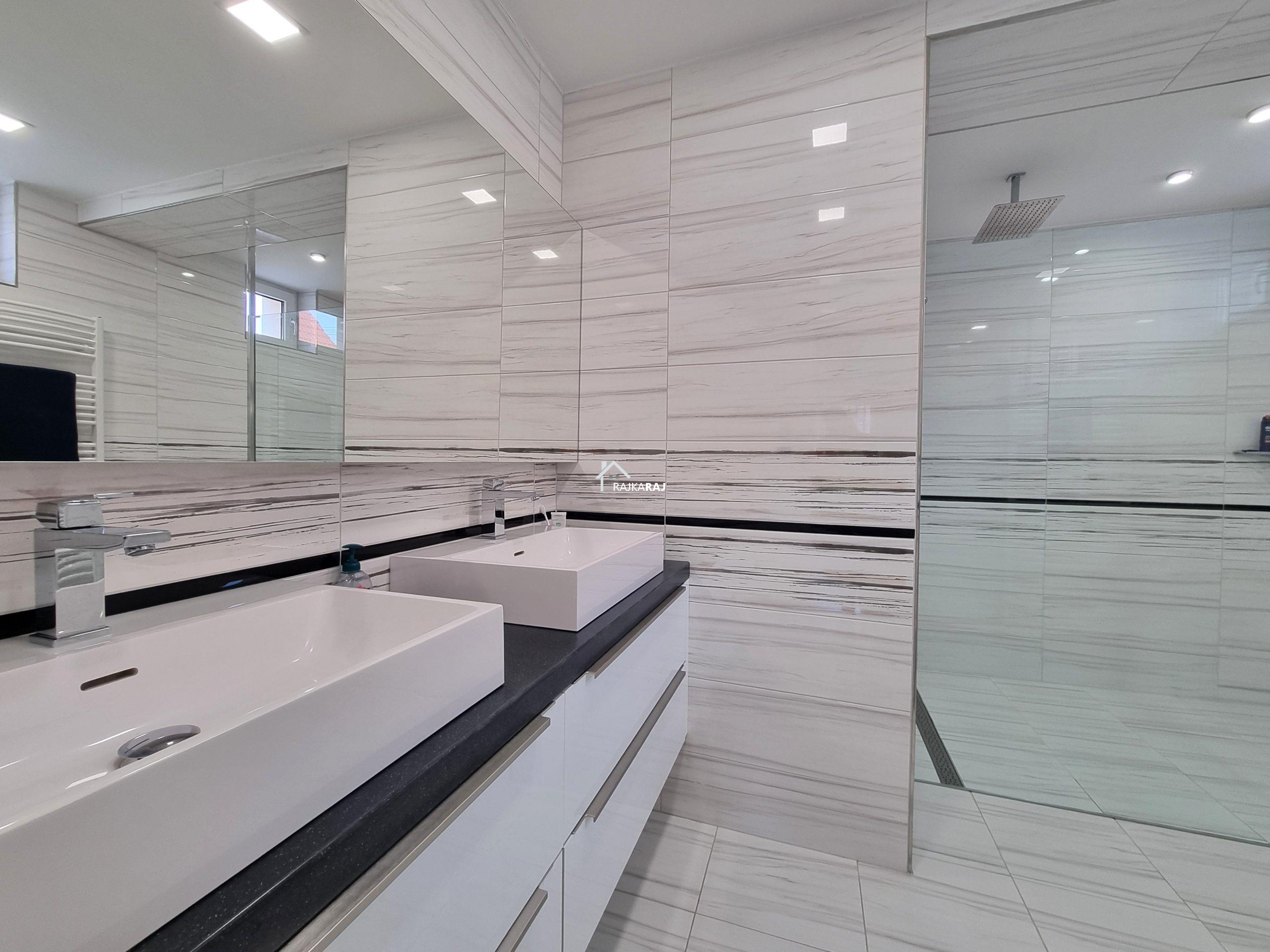 AZ ALSÓ SZINT HELYLISÉGEI: (95 m2) nappali 55 m2-en, konyha/étkező 25 m2-en, kamra, zuhanykabinos fürdőszoba dupla mosdóval, wc + piszoár külön helyiségben.