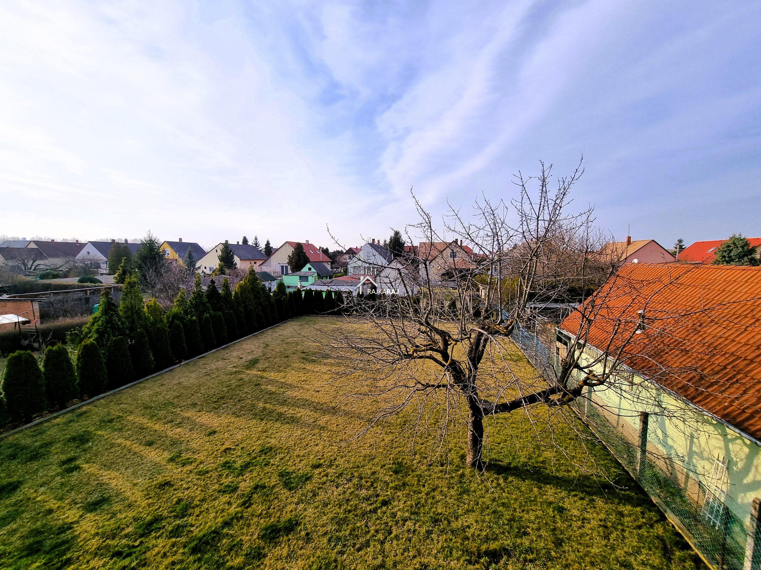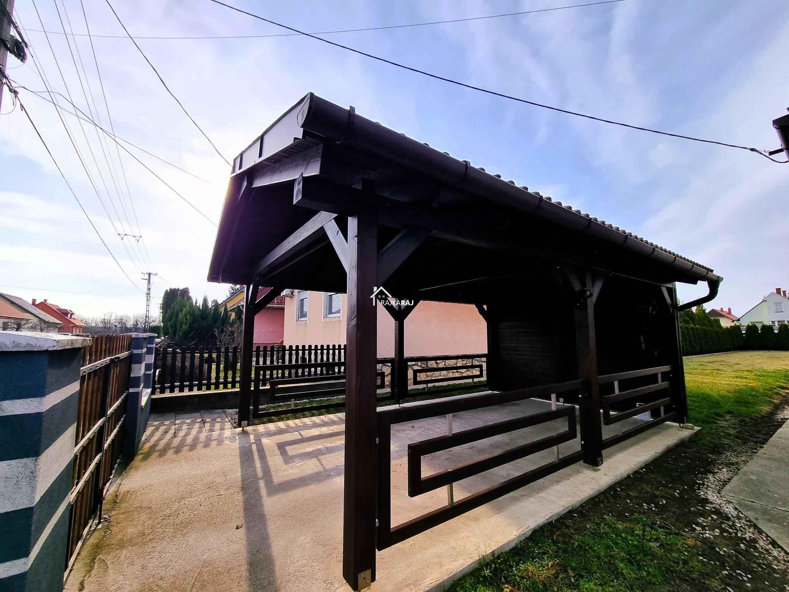 A ház területe alatt 90 m2-es pince van ahol a hátsó részből garázs is kialakítható. A bejáratnál térkövezett fedett kocsibeálló van. Az udvar rendezett és gondozott. Öntözése kútról megoldott.