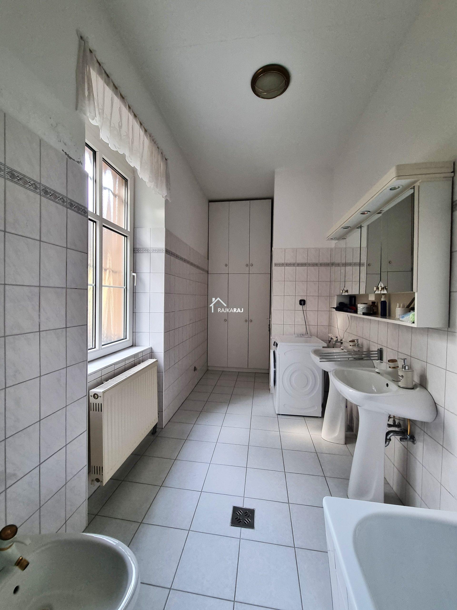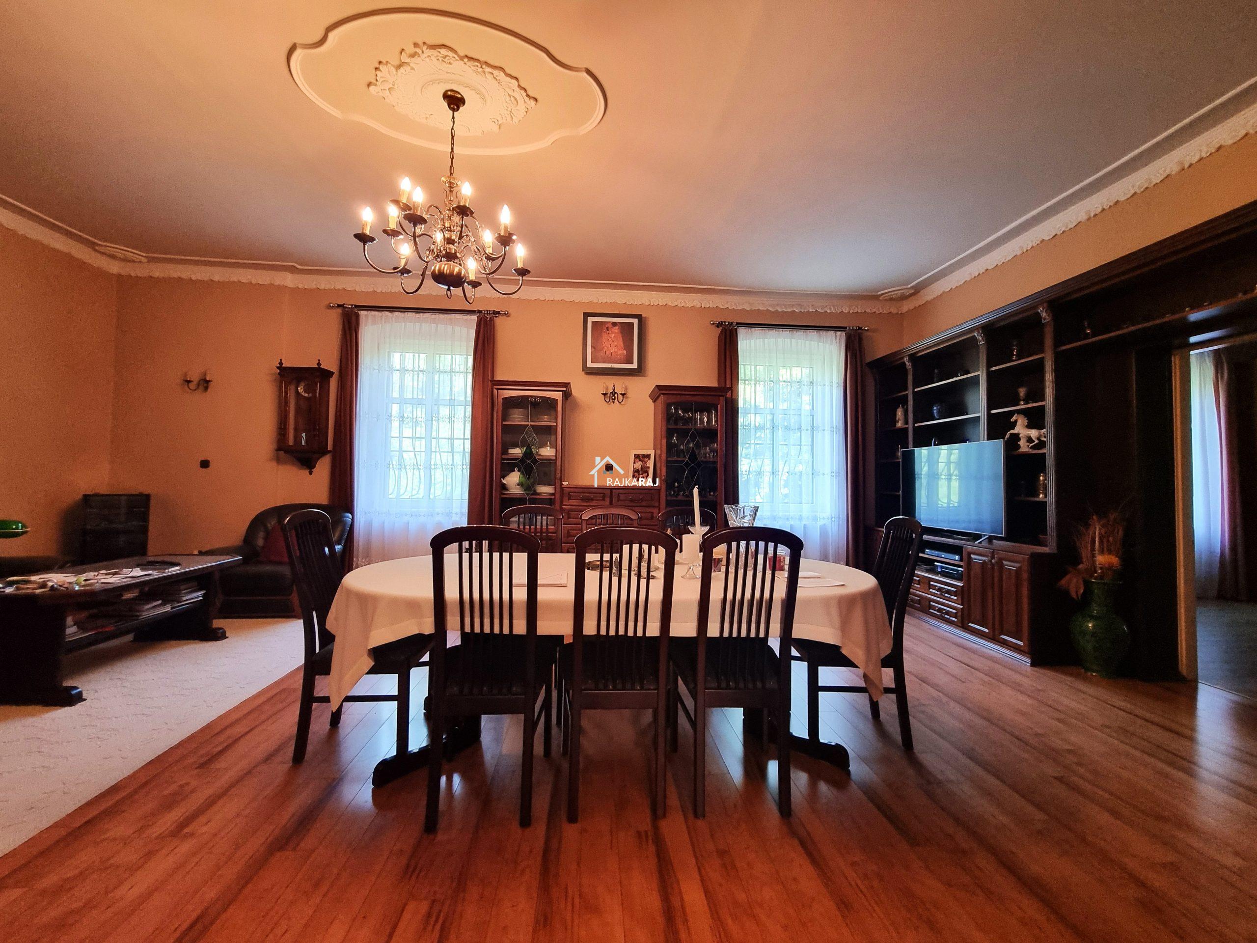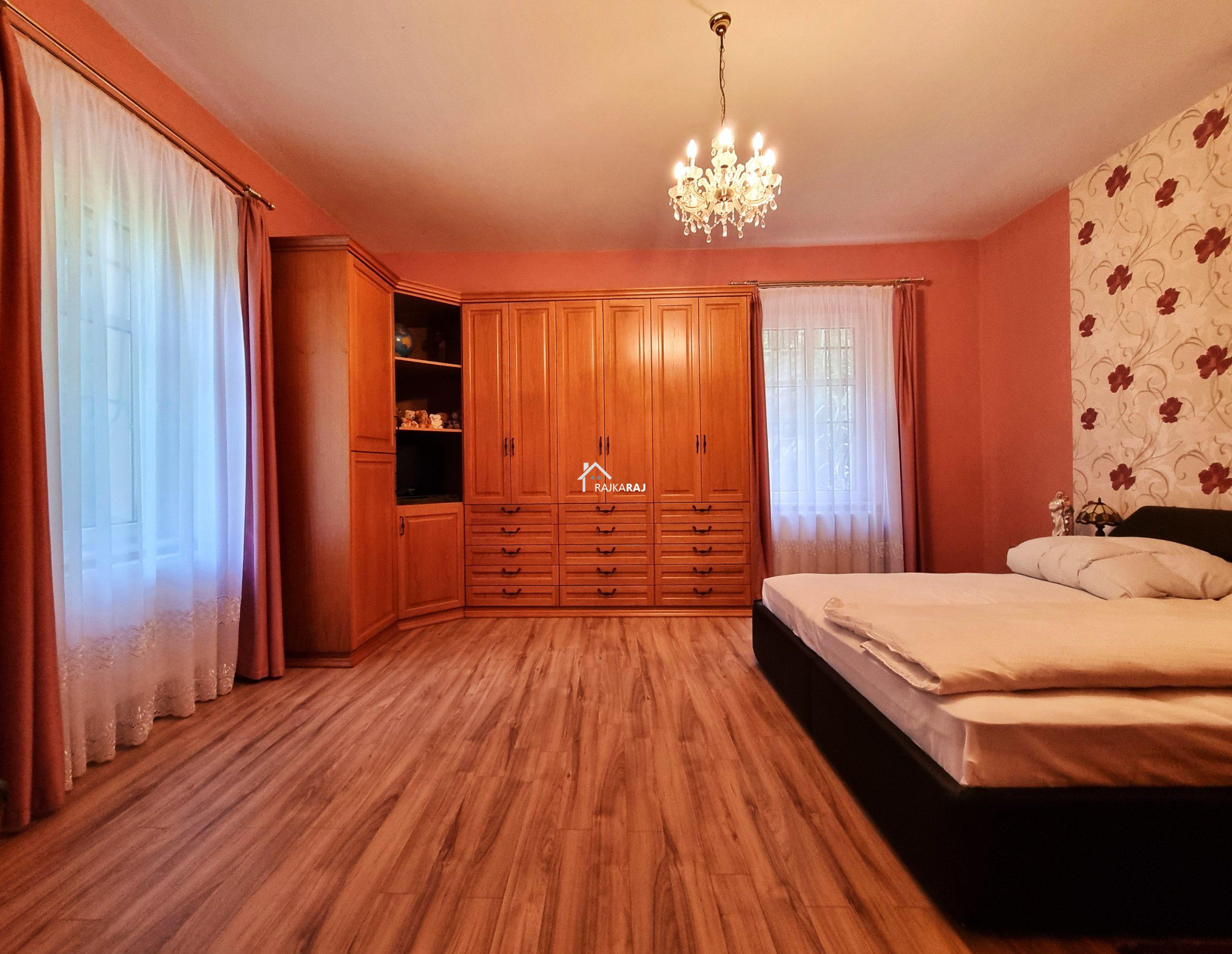 A LAKÓÉPÜLET HELYISÉGEI: előtér, konyha/étkező helyiség valamint innen nyíló spejz, 4 nagyméretű szoba, hatalmas társalgó/nappali tér, 2 kádas fürdőszoba + az egyik fürdőben zuhanykabinnal bidével + 2 wc-vel. Az épület előtt 48 m2-es fedett terasz található.  Mellette 40 m2-es zárt dupla garázs áll. A ház alatt 42 m2-es pince van. A lakóépület belmagassága 320 cm.