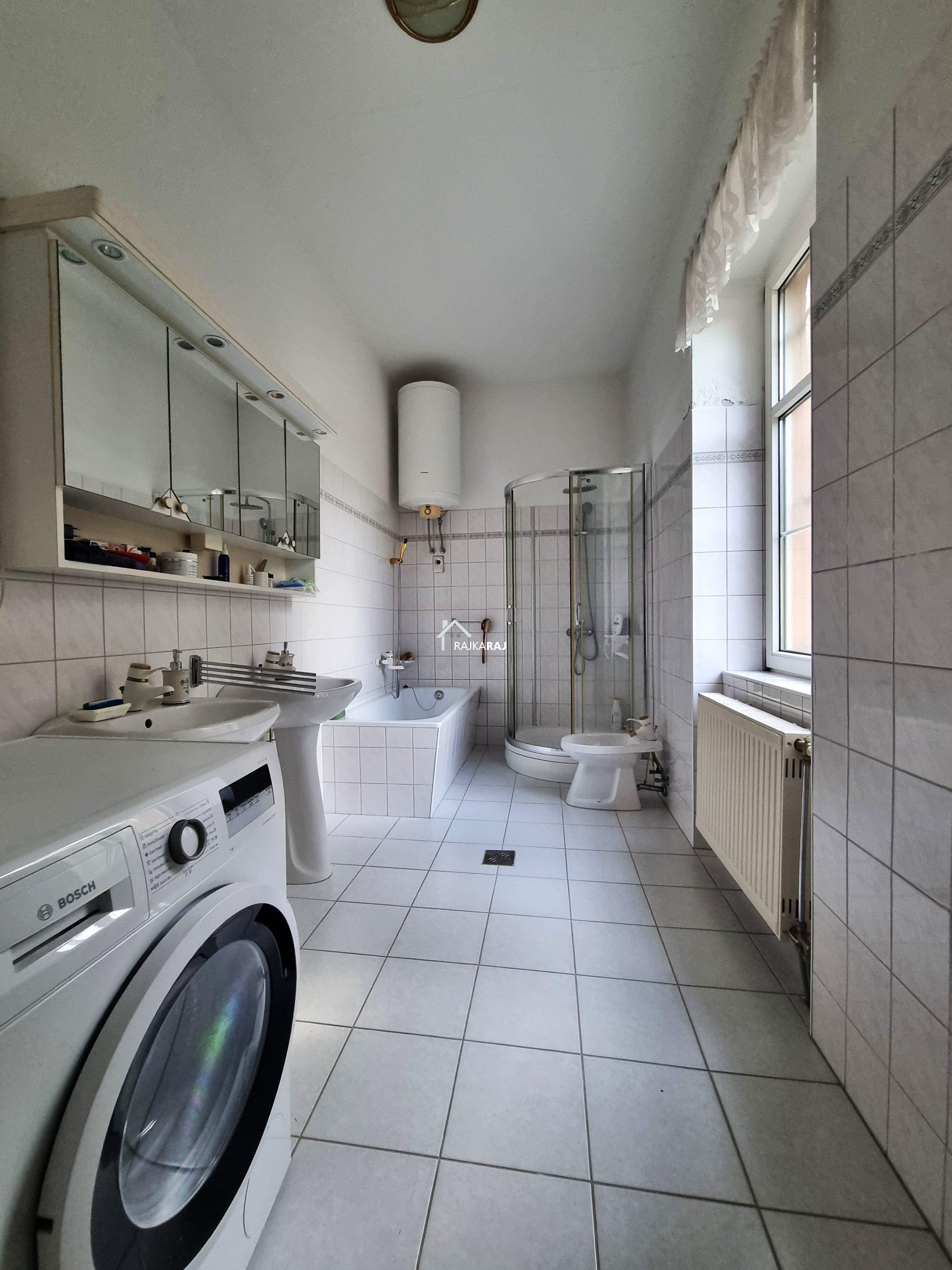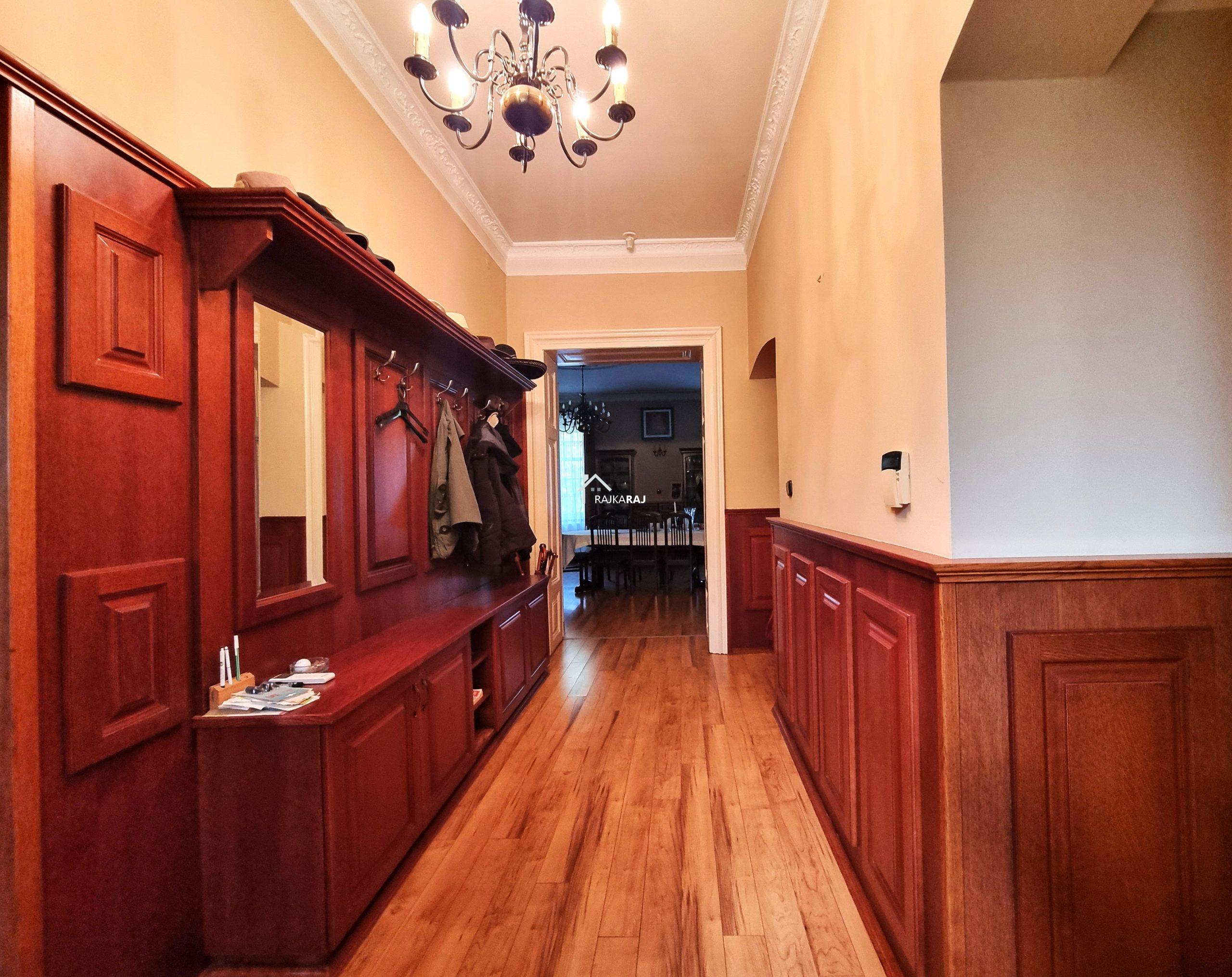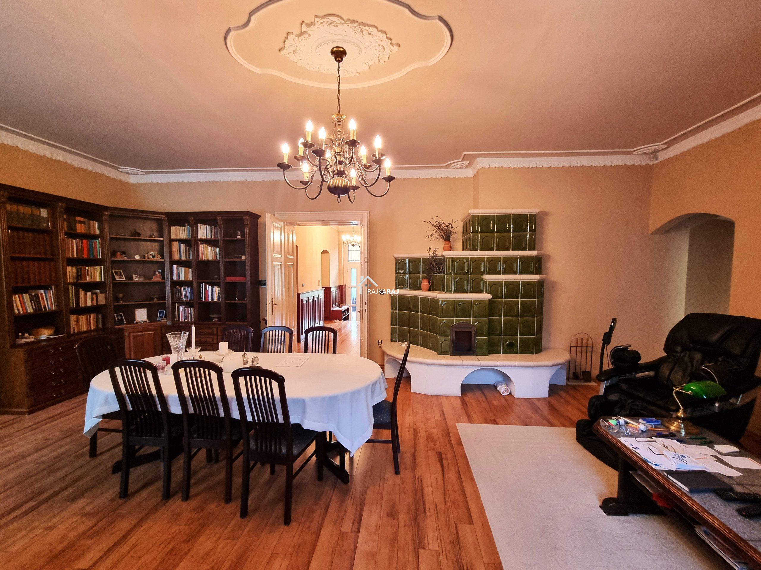 A LAKÓÉPÜLET HELYISÉGEI: előtér, konyha/étkező helyiség valamint innen nyíló spejz, 4 nagyméretű szoba, hatalmas társalgó/nappali tér, 2 kádas fürdőszoba + az egyik fürdőben zuhanykabinnal bidével + 2 wc-vel. Az épület előtt 48 m2-es fedett terasz található.  Mellette 40 m2-es zárt dupla garázs áll. A ház alatt 42 m2-es pince van. A lakóépület belmagassága 320 cm.