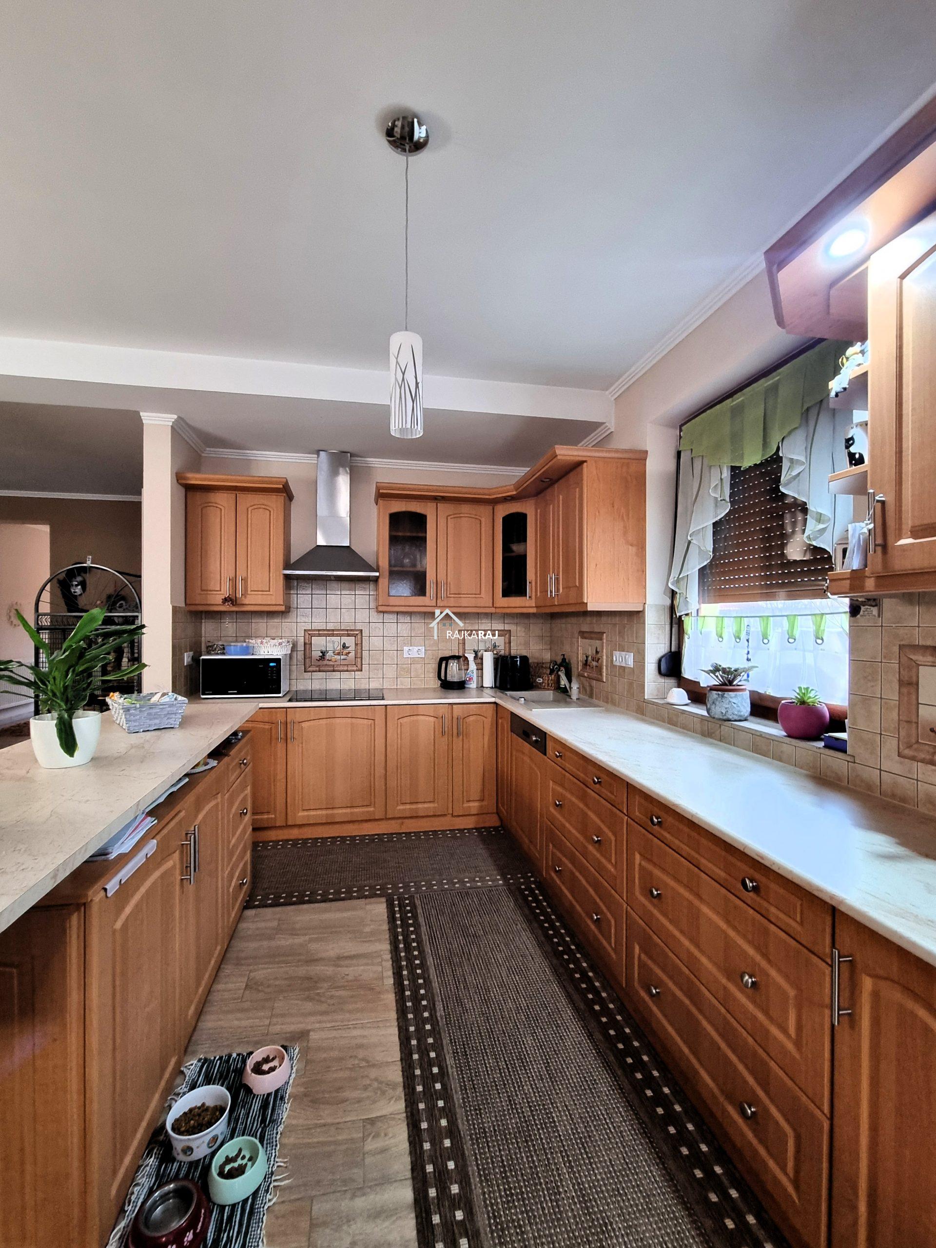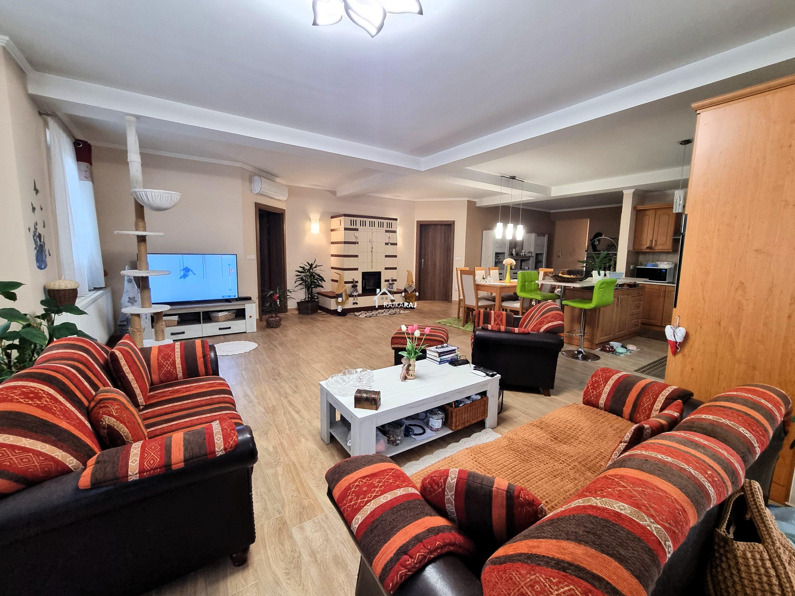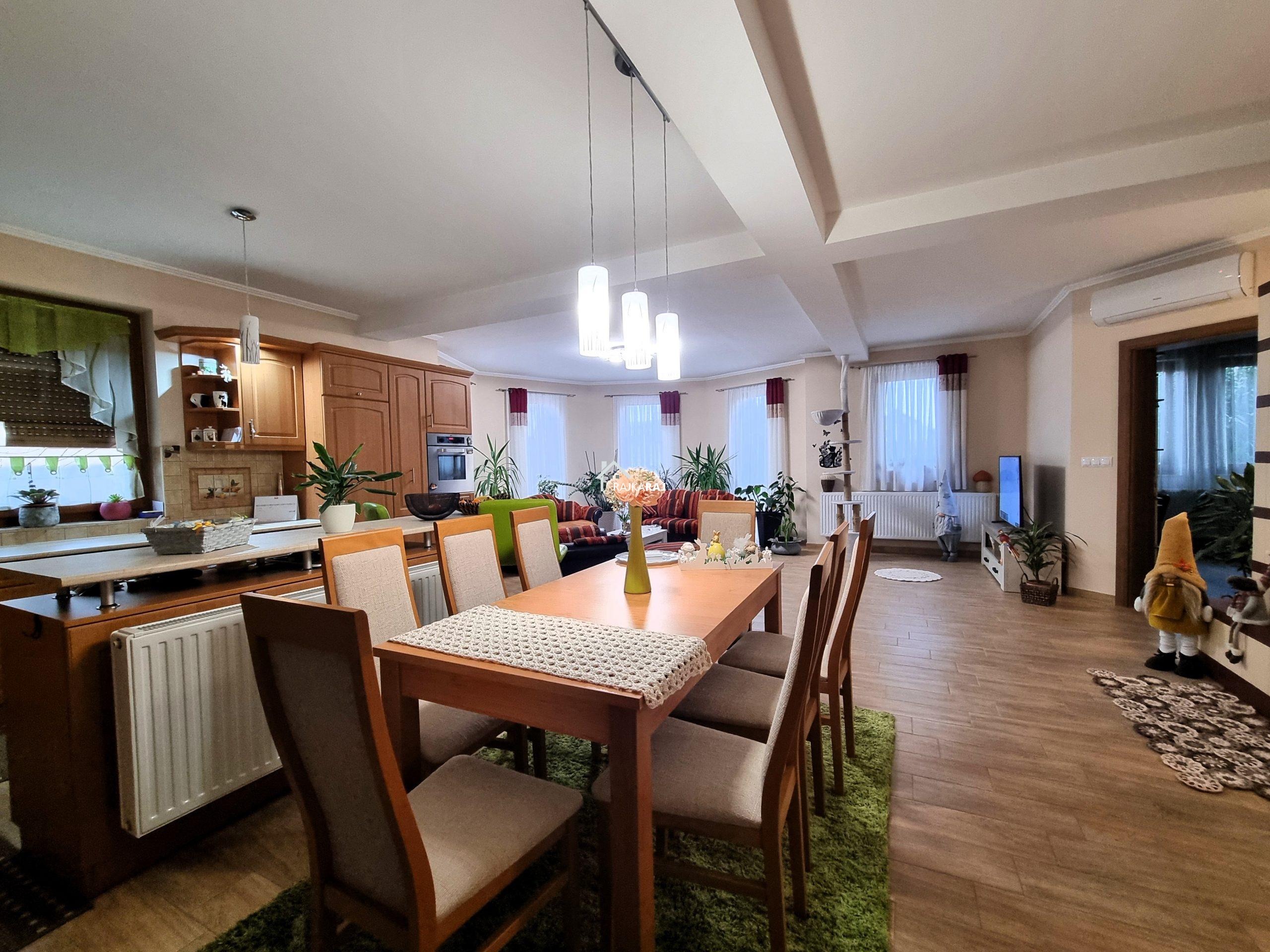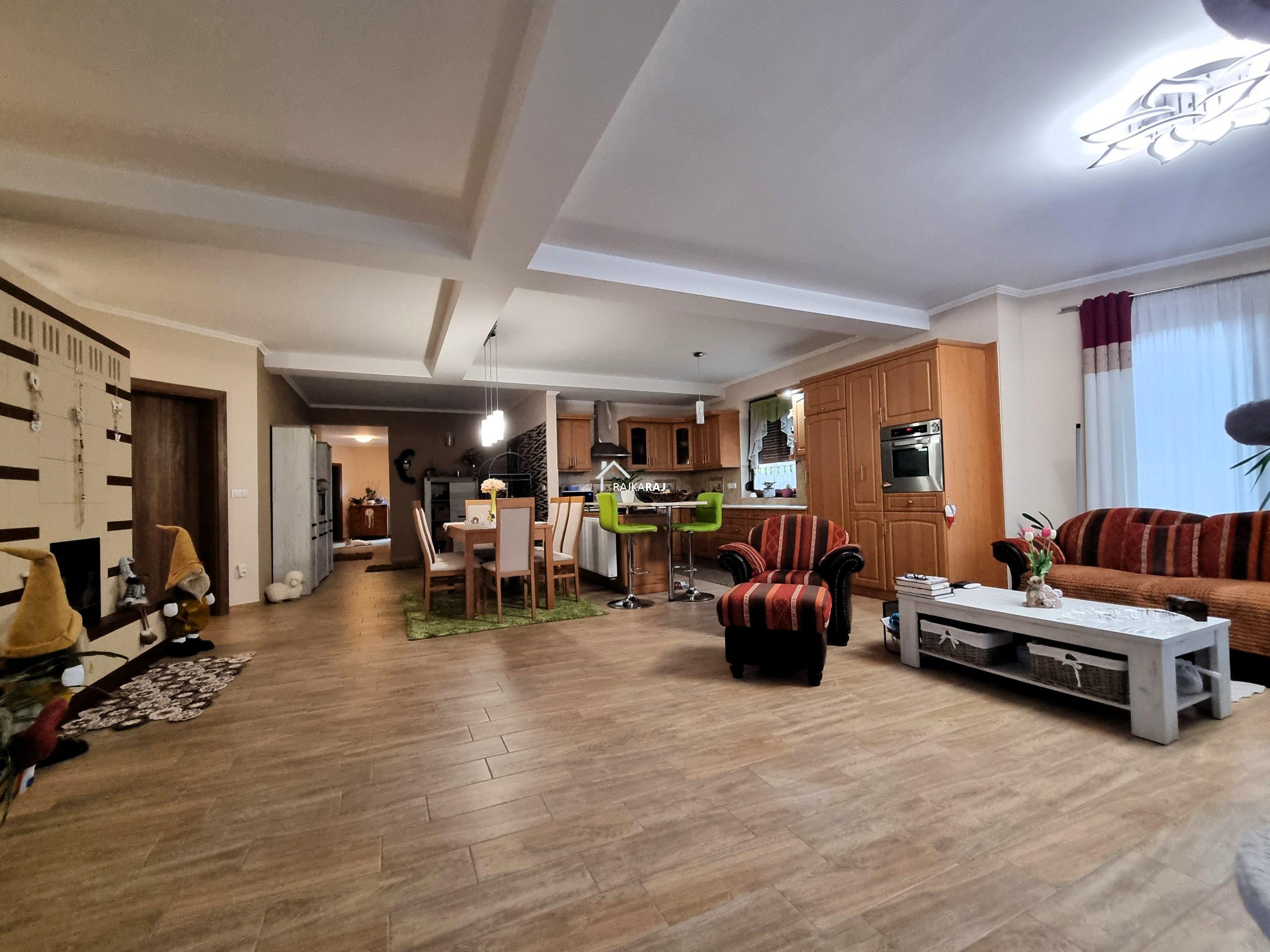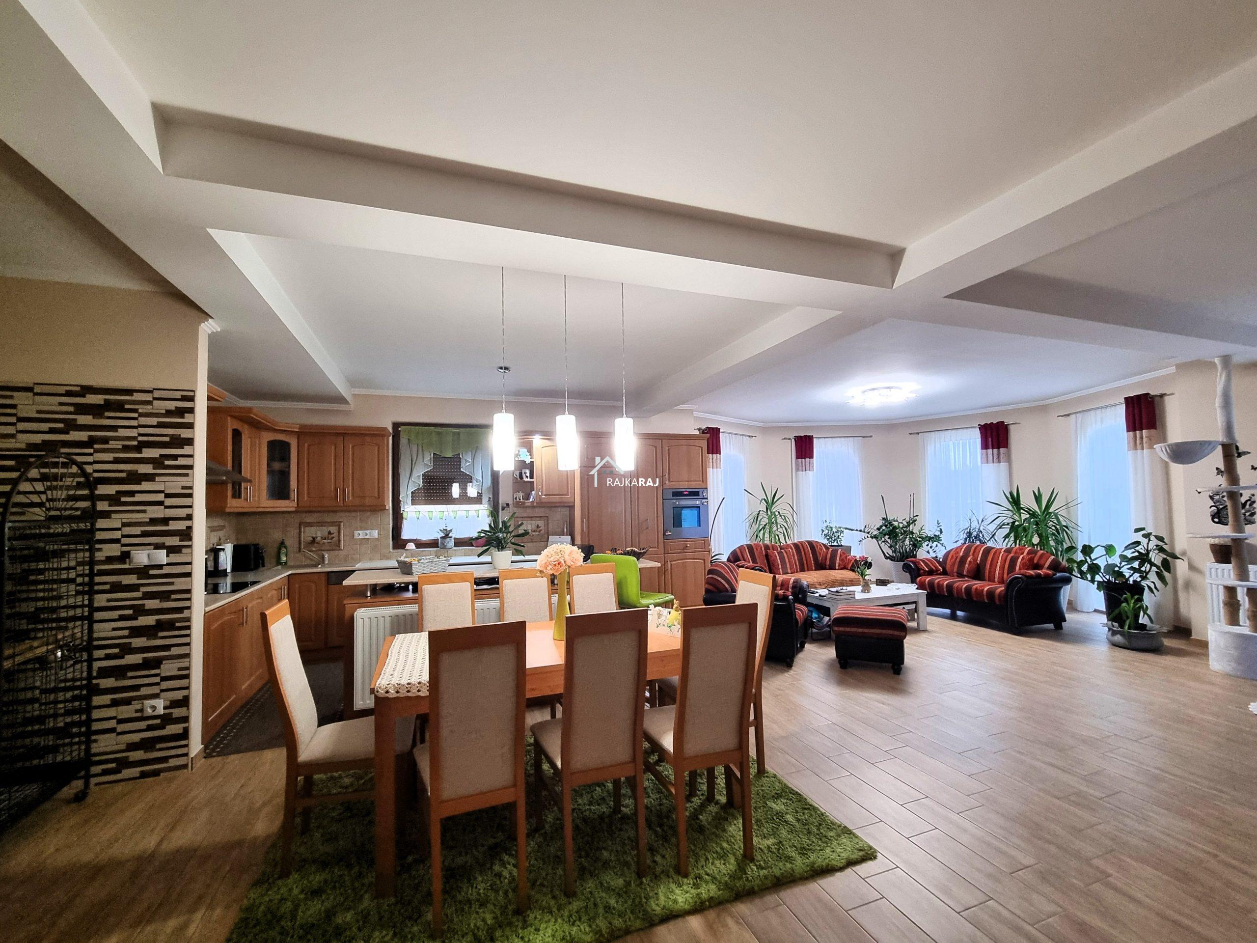 A LAKÓHÁZ HELYISÉGEI: előtér, csodálatos fényes és tágas amerikai konyhás nappali / étkező helyiség 73 m2-en,  4 szoba (4 x 14 m2-en). A szobákból 3 szoba elkülönül 1 pedig a nappaliból nyílik. Az ingatlannak 3 db fürdőszobája is van, melyből 2 közvetlenül szobából nyílik, ám az egyik fürdő 2 helyiség felől is megközelíthető. Ezekből az egyik kádas a másik pedig zuhanykabinos és mindegyikben wc is található. A különálló “fő” fürdőszoba kádas és épített zuhanykabinos szintén wc-vel.  Az ingatlanban 16 m2-es fűtött háztartási helyiség található mely a gépészetnek ad helyt de mosókonyhaként is hasznos. A hátsó közlekedőből 20 m2-es terasz nyílik.
