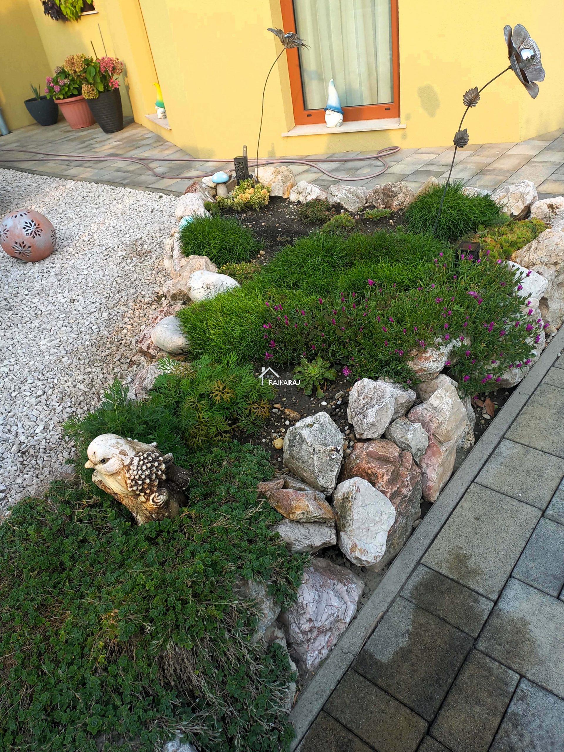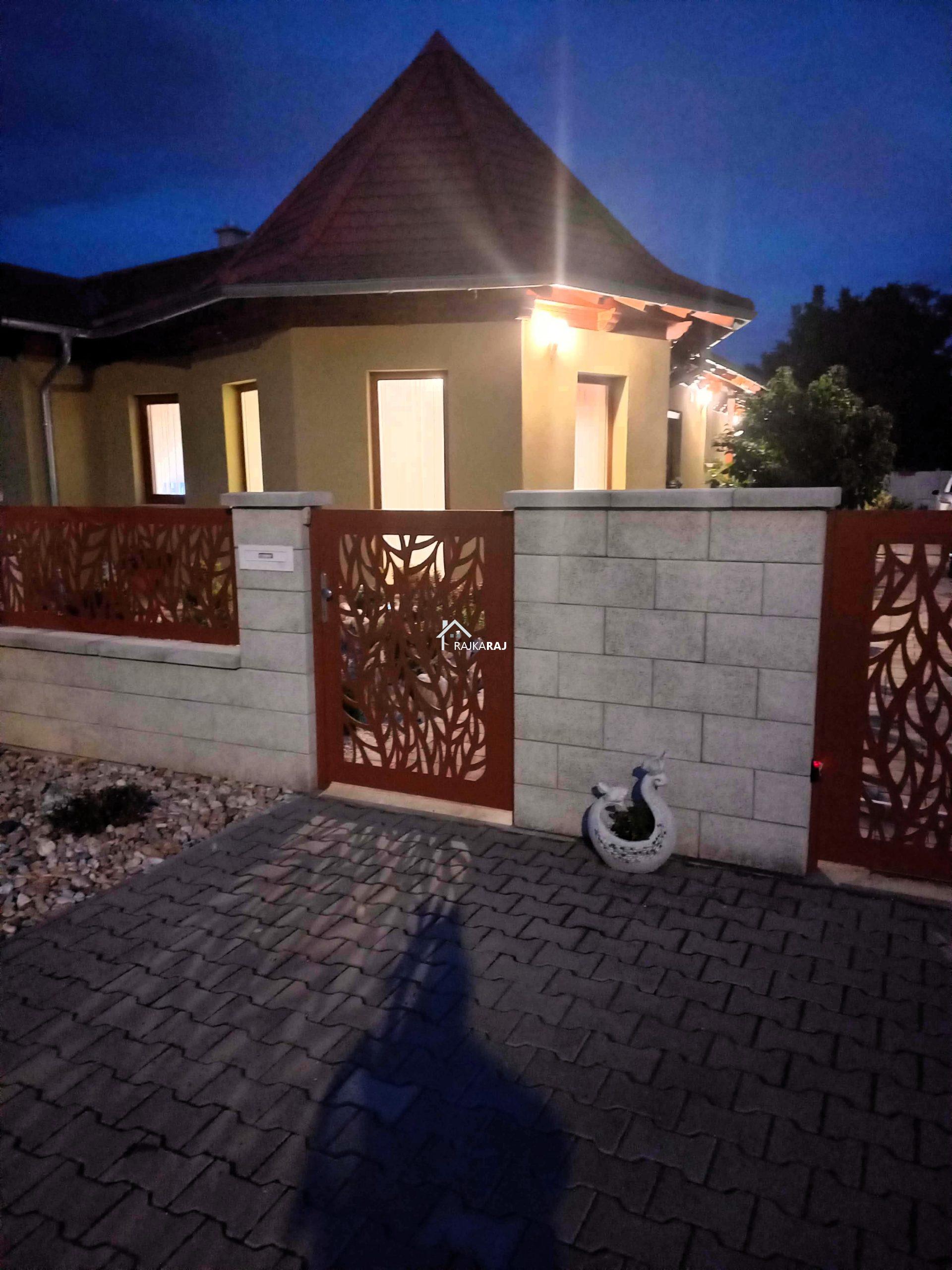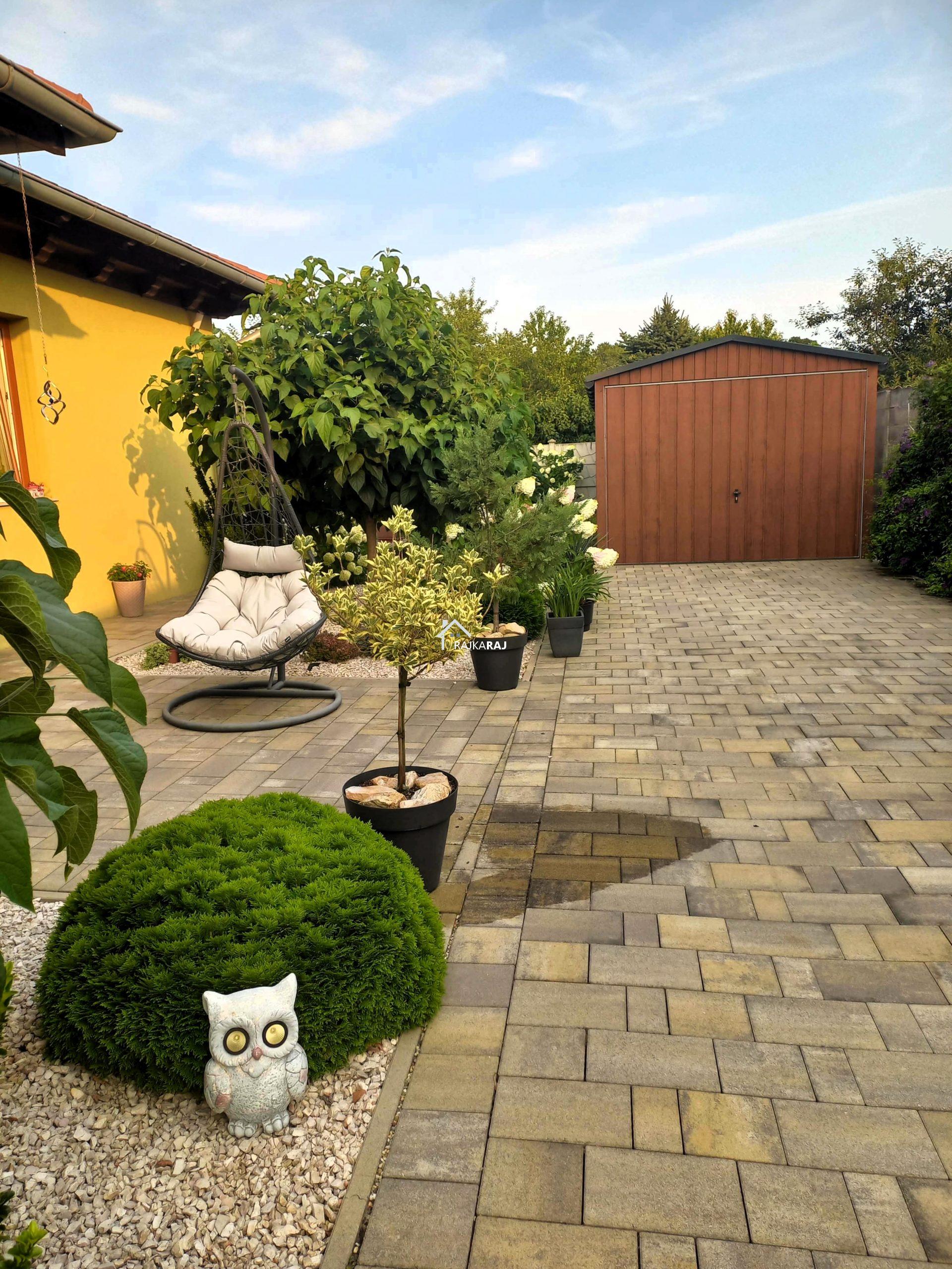 Az udvar gyönyörűen rendezett, részben térkövezett részben pedig füves terület. A kapu elektromos egyedi lézervágott kerítéssel. A 30 m2-es tároló kapuja szintén elektromos. A környék kedvelt, kertvárosias része a városnak.